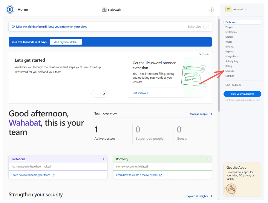 From the dashboard, navigate to the Security screen: